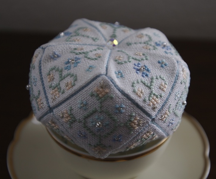 January and February found me busy working on a 15-sided biscornu. I named it porcelain Flowers, I wanted it to look a little like those antic fine porcelain items that look very pretty and we are never 100% sure what their use is. All decorated with flowers and sparkling.